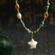 一枚可自由取戴的猛獁象牙冰料五星做吊墜,牙紋細膩清晰,質感溫潤如玉。搭配珍珠及碧璽鍍金鏤空鑲嵌件,以鍍金小珠與隔片銜接細節精緻而不張揚。多色光澤流轉,為設計注入一絲明豔靈動的氣息。整體搭配既清新雅緻,又隱含一絲大地與星空交織的象徵意味。