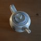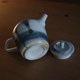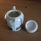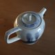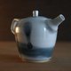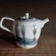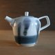 壺身下半部是一整片深藍綠,像水面或遠遠的山脈,往上有幾道被火拉開的藍、綠色垂直筆觸,像霧氣裡的樹影或山形。壺蓋邊緣則是一圈淡淡的藍紫暈染,讓整體看起來更柔和。