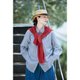 翻領,開門襟,紐扣也是條紋的。落肩式長袖,袖子需要長一點來增加她復古的摩登感,寬寬的袖剋夫和鈕子也是她的重點所在。