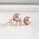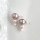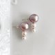 モーヴカラーのルベルパール(淡水パール)とチャイニーズアコヤ、アコヤパールの大きさの異なるパールを3粒、縦に並べたピアス。