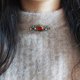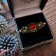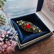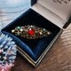 大顆的紅色玻璃仿寶石光澤透亮,與綠松石及珍珠搭配得恰到好處。鏤空鍍金底座帶有古典的文藝復興色彩。