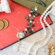 深い森を思わせるグリーンリーフに、真っ赤なベリー、淡いブルーのガラスビーズ。