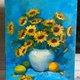 作品以鮮明的藍色為背景,襯托出一束盛放的向日葵,呈現出陽光與天空交融的視覺印象。白色花瓶與鮮黃花瓣形成強烈對比,帶來能量與希望的象徵。整幅畫筆觸大膽、色彩層層堆疊,散發出自由與熱情的生命力。
