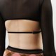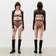 - Long-sleeve bikini top with sheer black mesh sleeves, lace-up front, bow tie detail, and refined metal studs