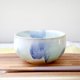 ふっくらと丸い鉢の形に成形し、艶やかな白い釉薬をかけ、数種類の青と緑の釉薬で模様を施しました。