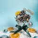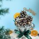 使用材料:松果5個、藍色永生苔蘚、白色永生苔癬、柳橙片1個、聖誕英文字立牌1個、白色雪花木片1個、聖誕裝飾配件(小松果)、卡斯比亞、金色裝飾珠3個、銀色裝飾珠5個