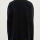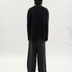 背部則以 拉克蘭袖式樣延伸,弧形剪接中分別拼接四片不等長布料,形成連續卻不規則的錯位線條,與前身直向線條形成對比。下擺、袖口與領口皆以縫份外露的不收邊設計呈現,邊緣刻意保留毛邊質感,展現粗獷而隨性的效果。
