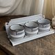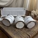 - 這是一個充滿復古魅力的古董法式琺瑯三件組廚房或洗衣房收納架,散發著經典的法式鄉村風格,白色琺瑯的底色搭配藍色的邊緣與字體,展現出經過時間洗禮的自然舊化與歲月痕跡,三個小罐子分別印有法文Savon(肥皂)、Soude(蘇打)和Sable(沙子