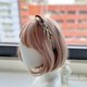 因為有許多買家喜歡簡單造型的髮箍,故挑選韓國進口的圖騰壓布條和素色織帶、搭在內側有平齒梳的髮箍架上,並加個扭結做裝飾,整體立體輕盈。