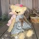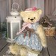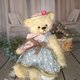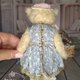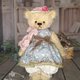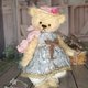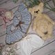 I made pantaloons and a dress for the bear. The pantaloons are decorated with lace and a ribbon. The dress is decorated with lace. I also made a canotier hat for the bear, which I decorated with a ribbon. The clothes are tinted with dry pastels.