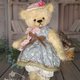 This handmade teddy bear is crafted from German mohair, filled with cedar shavings and wood wool, and weighted with mineral granules. It is made using traditional teddy bear techniques with discs and joints. The bear features glass eyes, an embroidered nose, and is toned with oil paints.