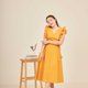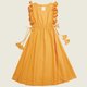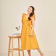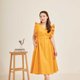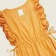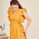 Sleeveless ruffle shoulder midi dress. Feature v-neck detail, pocket on both sides and double stretchy waistline with adjustable draw cord. Natural cotton oxford material adds a light, fresh look to any style.
