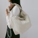 提把細節融入金屬件與抽繩元素;底部以抓皺設計塑造圓潤線條,使整體造型更顯蓬鬆飽滿,映襯出「輕拌」的層次感。