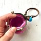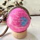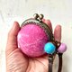 手のひらサイズの球体の羊毛フエルトがま口で、バックの外付けができるタイプです。