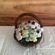 かごの中に飾られているブーケはピンク、ブルー、ホワイト、薄グリーンなどの淡いパステル調のクラフトバンドを使用しており、色彩豊かです。