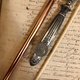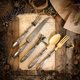 這一套美麗的餐具組,柄身為純銀有漂亮的緞帶花卉紋飾,頸部有法國純銀落款,刀刃、叉頭及羊腿夾頭為鋼,沙拉匙叉頭為Celluloïd,刀上面有巴黎字樣,手柄上有法國純銀Minerve印記。