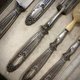 這組餐具有大型的肉類分食刀叉、羊腿夾以及沙拉分食匙叉,比較特別的是,這一組還帶著羊腿夾,通常這種組合比較少見,而且其中有三把餐具的純銀柄很粗,平量快要跟一個$10元直徑一樣(最後一張圖有對比粗吸管及免洗筷),這是一組兼具實用及觀賞性的古董收藏。