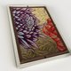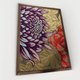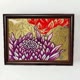 作品以華麗的**亂菊(Ran-giku,大菊花)**圖樣為主視覺,紫色花瓣穿梭於金色底紋之上,並點綴深紅色細節,展現出生命力、優雅與內斂的力量。在日本文化中,菊花象徵長壽、高潔與重生,使這件作品散發出恆久而吉祥的氣韻。