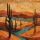 《沙海餘暉》以橙紅與靛藍為主色,描繪夕陽餘光下的沙丘世界。畫面中層疊的地貌在光影交錯間形成節奏,遠方的群山以柔霧覆蓋,前景的沙脊則如波浪般延伸,帶來無限的深度與韻律。這幅作品宛如一首以光作曲的詩,既寫實又抽象,讓人感受到時間在流動中的靜止。