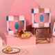- 以粉、金、藍色系交集、堆疊,往後的日子有彼此相伴 真好 ; 其中 箭頭紋飾象徵 持續 流動的時光, 表達用心 紀錄你我相愛的美好時刻, 輕盈的外裝滿載十款法式精緻糕點,享受永恆愛戀,幸福就在此刻。