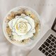 花材選用:厄瓜多爾永生玫瑰(白黑滾邊)、永生繡球花(白)、永生百萬星(金 )、永生情人果(淡粉)、法國小蠟梅(白)、永生風鈴果(銀)、永生羽毛草(橙)、永生高山羊齒蕨葉(金)、永生葉片(金)、蕾絲絲帶